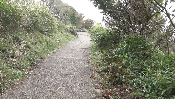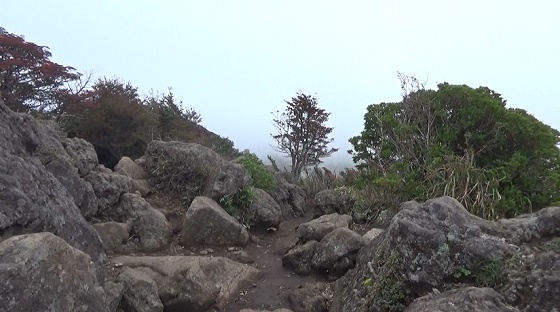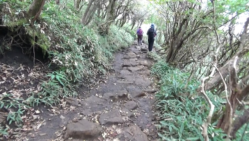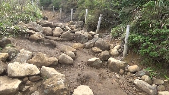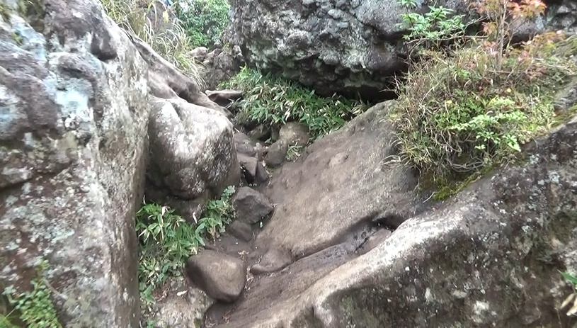 標高が上がり沓掛山の山上、階段を上がると岩場の道。こけな